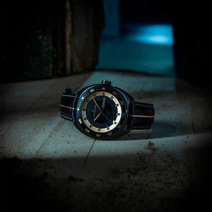Klockan har en karakteristisk kuddfömad boett på 42 mm, också med svart PVD behandling, men här kompletterad av lyxiga guldaccenter. Färgtemat "Gold and Noir" går igen på både urtavlan och armbandet. Det svarta läderarmbandet med krokodilmönster är dekorerat med en tunn guldrand genom mitten, vilket binder samman hela klockans visuella uttryck. På boettens baksida finner man geometriska motiv som återspeglar Graces strukturerade logik och skarpa fokus.