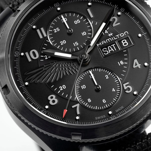 H71636330 är utrustad med en 42 mm boett i rostfritt stål med en svart PVD-beläggning, vilket ger klockan ett matt och stealth-liknande utseende. Kronan är modellerad efter justeringsratten på ett kikarsikte, medan kronografknapparna är formade som patronhylsor. Vid klockan 9 på urtavlan finner man ett vingemblem som symboliserar böner för fallna kamrater, vilket tillför en djup betydelse till designen.